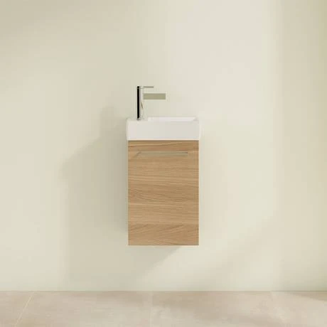 Villeroy & Boch Avento furniture is practical, beautiful and a real highlight in the bathroom. Thanks to its compact design, this Nordic Oak 360mm Wall Hung Vanity Unit is ideal for cloakrooms or small bathrooms. The white ceramic basin features a right handed bowl and single tap hole. The door is fitted with soft close hinges and is available in a left or right hand opening.