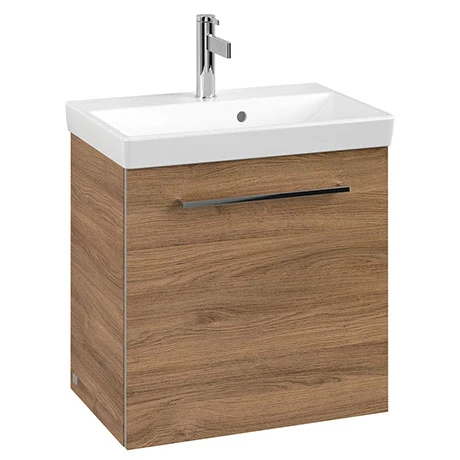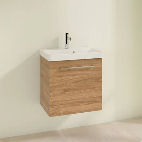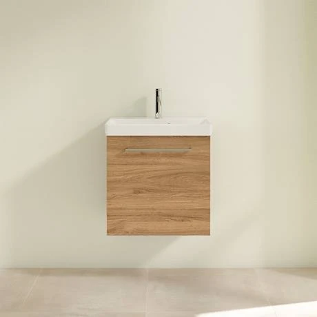 Villeroy & Boch Avento furniture is practical, beautiful and a real highlight in the bathroom. This Oak Kansas 550mm Wall Hung 1-Door Vanity Unit has generous storage space thanks to clever interior arrangement and its shock-absorbing, soft-closing door that slows down the door and automatically closes it, slowly and silently. The white ceramic basin offers a generous wash area and features a single tap hole. Visual highlights with champagne-coloured decorative edges and classy chrome handles give a light and modern look.